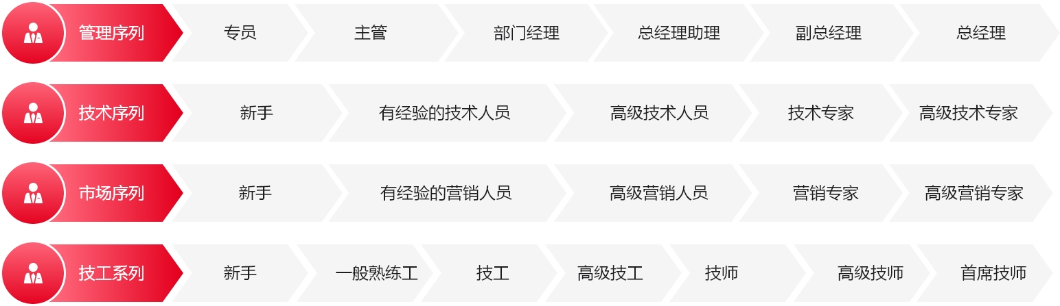为使员工快速成长,实现员工职业发展和公司发展相统一,公司帮助员工制定绩效改进和未来发展规划,并进行跟踪培养。提供了多种职业晋升途径: