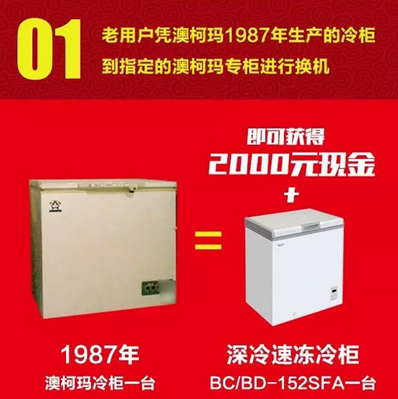 自4月1日-6月30日期间,澳柯玛老用户凭购买的1987年生产的冷柜(BD-150L),可到澳柯玛全国各大专柜现场换购一台新品深冷速冻冷柜(BC/BD-152SFA),此外,还可获得2000元现金奖励。