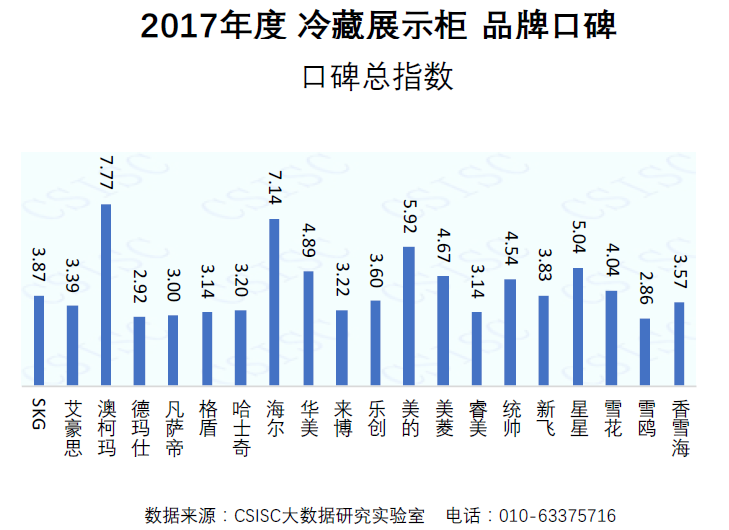 2017年12月19日,中国统计信息服务中心大数据研究实验室与中国质量新闻网联合发布了《2017年度中国冷藏展示柜品牌口碑研究报告》(以下简称《报告》)。冷藏展示柜口碑总榜出炉,澳柯玛从20个品牌中脱颖而出再登榜首。