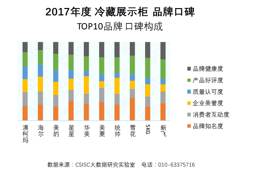 本期研究结果显示,2017年度冷藏展示柜品牌口碑的十佳品牌有澳柯玛、海尔、美的、星星、华美、美菱、统帅、雪花、SKG、新飞。TOP10品牌的指数构成中,多数品牌在六个维度方面的分布比例比较均衡;品牌知名度所占比例最高,质量认可度所占比例最低;质量认可度差异较大,产品好评度差异较小。自左向右横向来看,质量认可度递减,产品好评度递增,品牌健康度递增。TOP10品牌的口碑构成如下图所示: