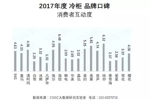 消费者互动度:海信、统帅、美菱品牌在消费者互动度中位居前三。美菱、美的、澳柯玛、海尔、容声、樱花在近两期中表现稳定,消费者互动度位居前十。海信、统帅、SKG、奥马在本期消费者互动度中有强劲表现,晋升至前十,华美、星星、晶弘、雪花则在本期消费者互动度中掉出前十。
