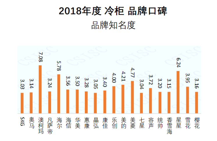 品牌知名度:澳柯玛、星星、海尔在品牌知名度中位居前三。澳柯玛、星星、海尔、美菱、美的、容声、海信、华美在近两期中表现稳定,品牌知名度位居前十。