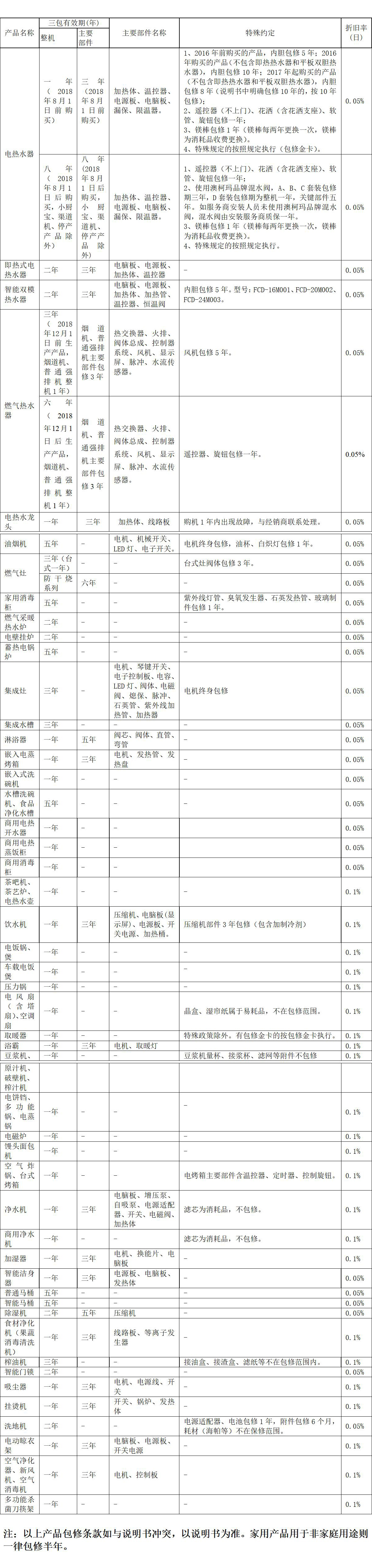 2 产品包修期限表